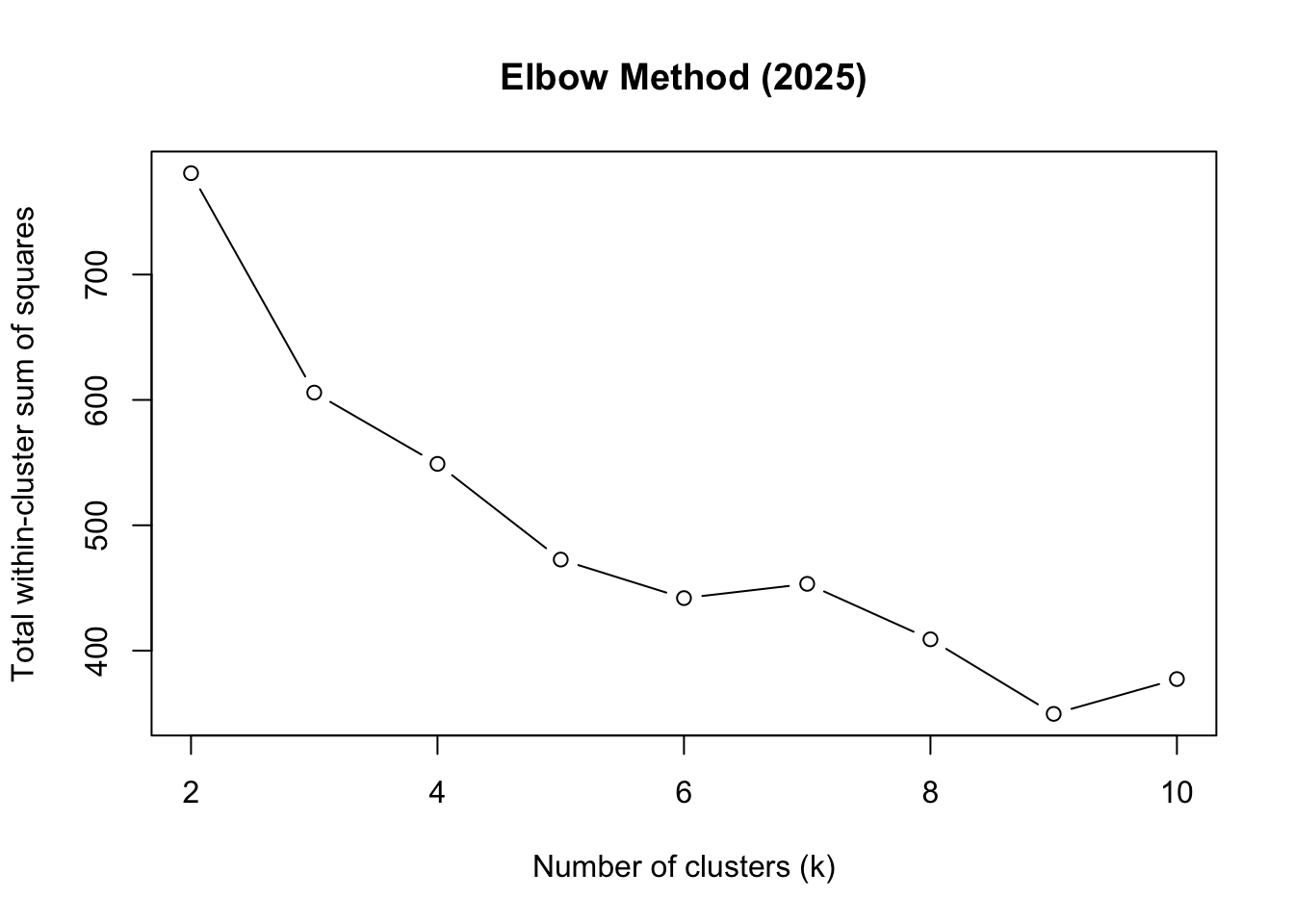 The k-prototypes clustering reveals clinically interpretable subgroups within the 2025 population, reflecting distinct metabolic profiles rather than arbitrary partitions.
