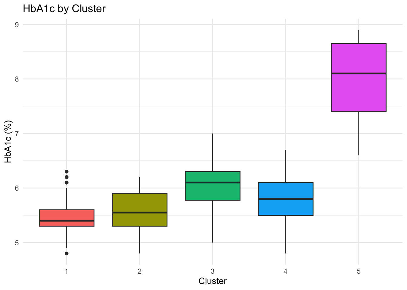 labs(title = "HbA1c by Cluster", x = "Cluster", y = "HbA1c (%)") +